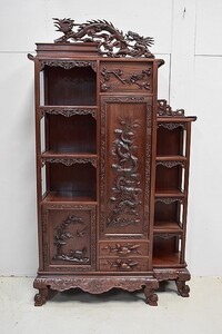 Cet étonnant Cabinet ouvre par deux portes : une première, en bas, à la façade décorée d’oiseaux de basse cour picorant à l’abri de bambous, découvre un espace nu de 50 cm de haut. Une seconde, dans la partie centrale, dévoile trois étagères de 33.5 cm de profondeur, posées sur crémaillères et donc réglables à souhait sur une hauteur totale de 101 cm. Elle arbore sur sa face visible un généreux Décor de Dragon, semblant entrelacer un arbre taillé à la Japonaise. Ces deux vantaux voient leurs contours soulignés par des frises sculptées formant encadrements et ils sont dotés de deux discrètes poignées de tirages presque indistinctes du reste du meuble.