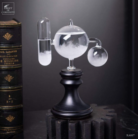 L’amiral Fitzroy a, parait-il, échappé à une tempête lors d’un tour du monde avec Darwin en 1836, grâce à cette invention! Cette invention a pour but de prévoir le temps: le tube hermétique comprend un mélange d’eau distillée, d’éthanol, de nitrate de potassium, chlorure d’ammonium et du camphre. Les changements de cristallisation à l’intérieur des sphères doivent permettre de prévoir le temps. Il semble que l’intérêt pour prédire le temps soit incertain, par contre comme curiosité: c’est le summum!